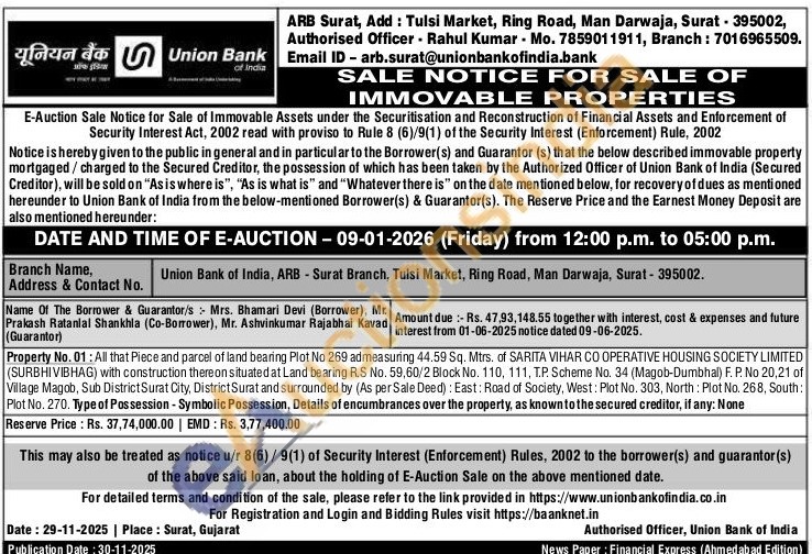 Property No. 01: All that Piece and parcel of land bearing Plot No 269 admeasuring 44.59 Sq. Mtrs. of SARITA VIHAR CO OPERATIVE HOUSING SOCIETY LIMITED (SURBHIVIBHAG) with construction there on situated at Land bearing R.S No. 59,60/2 Block No. 110, 111, T.P. Scheme No. 34 (Magob-Dumbhal) F. P. No 20,21 of Village Magob, Sub District Surat City, District Surat and surrounded by (As per Sale Deed): East: Road of Society, West: Plot No. 303, North: Plot No. 268, South: Plot No. 270