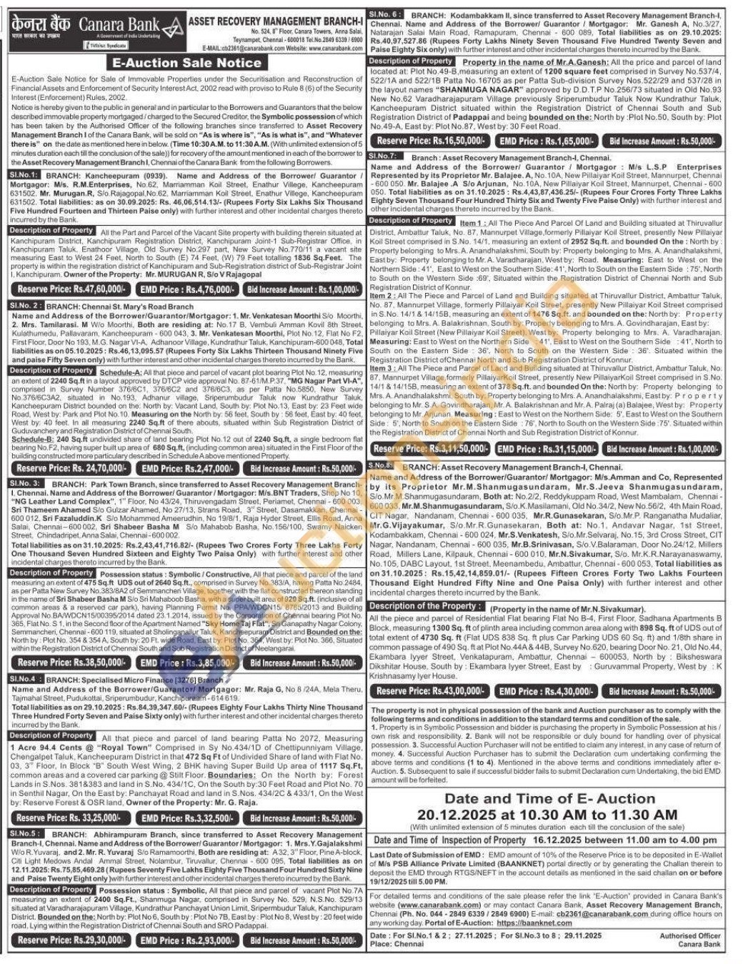 4) All that piece and parcel of land bearing Patta No 2072, Measuring 1 Acre 94.4 Cents @ "Royal Town" Comprised in Sy No.434/1D of Chettipunniyam Village, Chengalpet Taluk, Kancheepuram District in that 472 Sq Ft of Undivided Share of land with Flat No. 03, 3 Floor, In Block "B" South West Wing, 2 BHK having Super Build Up area of 1117 Sq.Ft, common areas and a covered car parking @ Stilt Floor. Boundaries: On the North by: Forest Lands in S.Nos. 3818383 and land in S.No. 434/1C, On the South by:30 Feet Road and Plot No. 70 in Senthil Nagar, On the East by: Panchayat Road and land in S.Nos. 434/2C & 433/1, On the West by: Reserve Forest & OSR land, Owner of the Property: Mr. G. Raja.