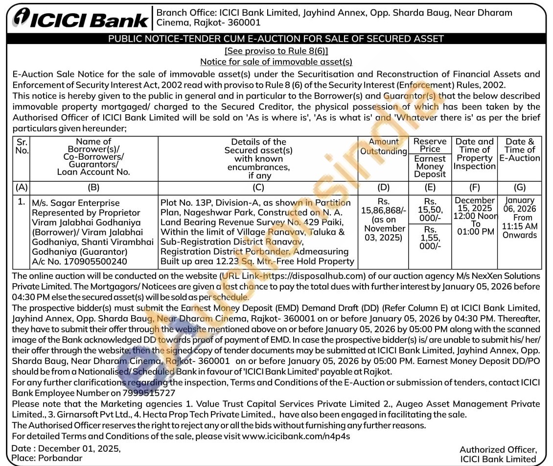 Plot No. 13P, Division-A, as shown in Partition Plan, Nageshwar Park, Constructed on N. A. Land Bearing Revenue Survey No. 429 Paiki, Within the limit of Village Ranavav, Taluka & Sub-Registration District Ranavav, Registration District Porbander. Admeasuring Built up area 12.23 Sq. Mtr.-Free Hold Property