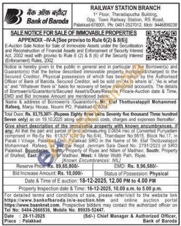any: All that the part and parcel of land admeasuring 0.0654 Hec of Converted Puriyadam comprised in Re-Sy No. 613/37 (Old Sy No 6/4), Thandaper No. 9815 Block No. 17, in Parali I Village, Palakkad Dist., Palakkad SRO in the Name of Mr. Elaf Thottuvalapoil Mohammed Rafeeq, as per the Regd. Jenmam Sale Deed No. 2791/2023 of SRO Palakkad Boundaries: North: Property of Riyas and Nilam of Madhav, South: Property of Shafeel, East: Property of Madhavi, West: 4 Meler Width Pach, Riyas