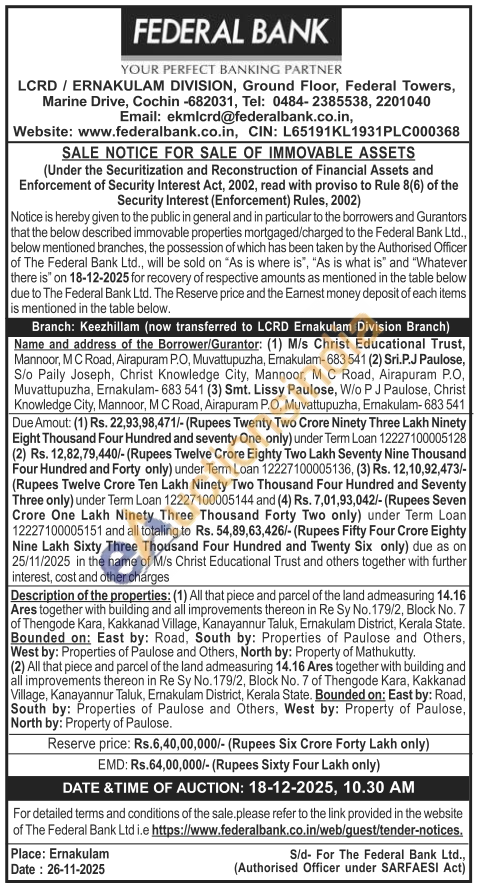 1) All that piece and parcel of the land admeasuring 14.16 Ares together with building and all improvements thereon in Re Sy No. 179/2, Block No. 7 of Thengode Kara, Kakkanad Village, Kanayannur Taluk, Ernakulam District, Kerala State. Bounded on: East by: Road, South by: Properties of Paulose and Others, West by: Properties of Paulose and Others, North by: Property of Mathukutty. (2) All that piece and parcel of the land admeasuring 14.16 Ares together with building and all improvements thereon in Re Sy No. 179/2, Block No. 7 of Thengode Kara, Kakkanad Village, Kanayannur Taluk, Emakulam District, Kerala State. Bounded on: East by: Road, South by: Properties of Paulose and Others, West by: Property of Paulose, North by: Property of Paulose.