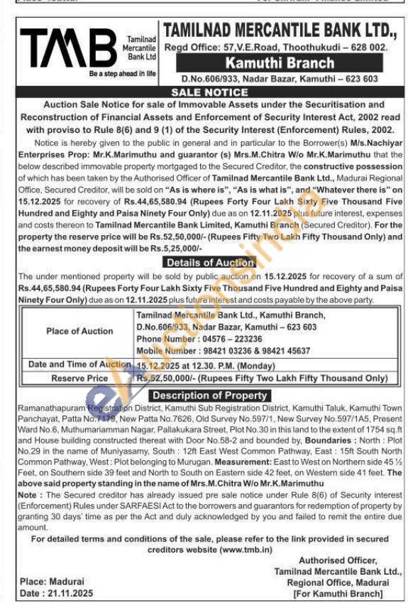 Ramanathapuram Registration District, Kamuthi Sub Registration District, Kamuthi Taluk, Kamuthi Town Panchayat, Patta No.7179, New Patta No.7626, Old Survey No.597/1, New Survey No.597/1A5, Present Ward No.6, Muthumariamman Nagar, Pallakukara Street, Plot No.30 in this land to the extent of 1754 sq.ft and House building constructed thereat with Door No.58-2 and bounded by, Boundaries: North: Plot No.29 in the name of Muniyasamy, South 12ft East West Common Pathway, East: 15ft South North Common Pathway, West: Plot belonging to Murugan. Measurement: East to West on Northern side 45% Feet, on Southern side 39 feet and North to South on Eastern side 42 feet, on Western side 41 feet. The above said property standing in the name of Mrs.M.Chitra W/o Mr.K.Marimuthu
