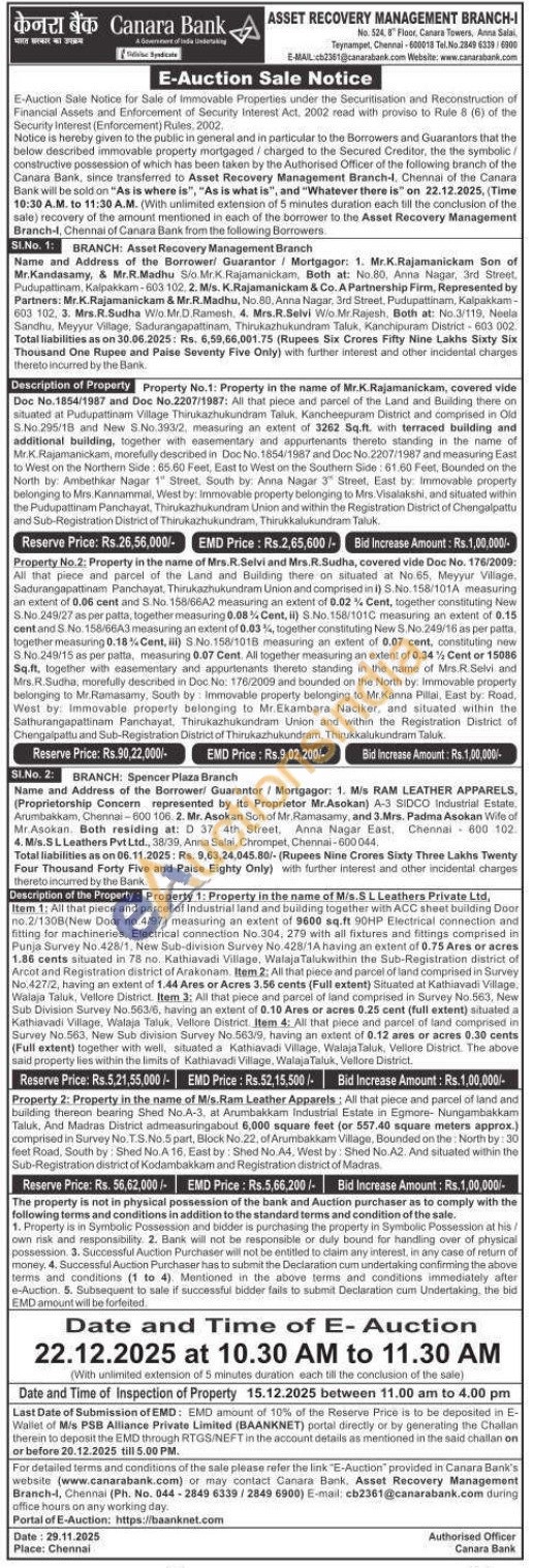Property 2: Property in the name of M/s.Ram Leather Apparels: All that piece and parcel of land and building thereon bearing Shed No.A-3, at Arumbakkam Industrial Estate in Egmore- Nungambakkam Taluk, And Madras District admeasuringabout 6,000 square feet (or 557.40 square meters approx.) comprised in Survey No.T.S.No.5 part, Block No.22, of Arumbakkam Village, Bounded on the North by: 30 feet Road, South by: Shed No.A 16, East by: Shed No A4, West by: Shed No.A2. And situated within the Sub-Registration district of Kodambakkam and Registration district of Madras
