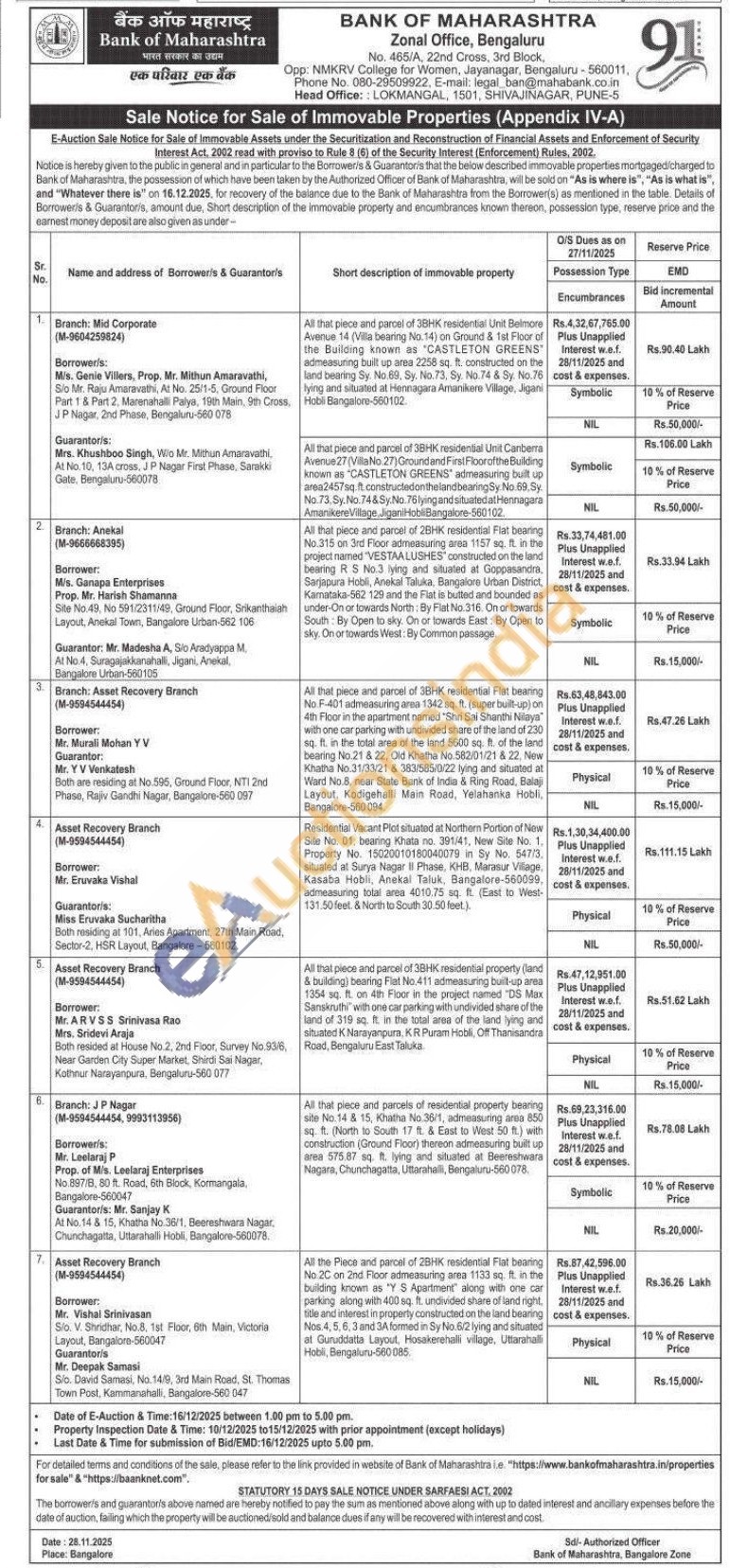7) All the Piece and parcel of 2BHK residential Flat bearing No 20 on 2nd Floor admeasuring area 1133 sq. ft. in the building known as "Y S Apartment" along with one car parking along with 400 sq. ft. undivided share of land right, title and interest in property constructed on the land bearing Nos. 4, 5, 6, 3 and 3A formed in Sy No.6/2 lying and situated at Guruddatta Layout, Hosakerehalli village, Uttarahalli Hobli, Bengaluru-560085.