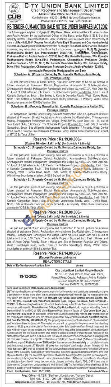 3) All part and parcel of land existing now and construction to be put up there on in future situated at prakasam District Registration, Ammanabrolu Sub-Registration, Chinnaganjam Mandal, Peddaganjam Panchayath and Village. Surve No.609/3, Near Door No. 1-14 out of total extent of Ac.0.19 Cents. The Schedule Property Bounded by East: House and Site of Asodi Durga Redddy, South House and Site of Motamari Raghava and Others, West Panchayati Road, North Site Of Komatia Venkatappa Reddy. Within these boundaries an extent of 435,6 Sq. Yards of Site.