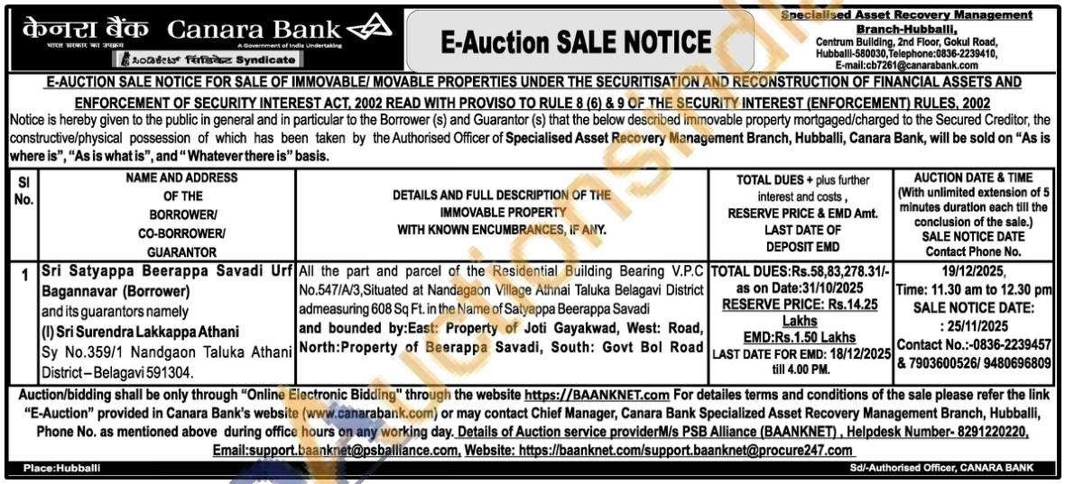 All the part and parcel of the Residential Building Bearing V.P.C No.547/A/3, Situated at Nandagaon Village Athnai Taluka Belagavi District admeasuring 608 Sq Ft. in the Name of Satyappa Beerappa Savadi and bounded by: East: Property of Joti Gayakwad, West: Road, North: Property of Beerappa Savadi, South: Govt Bol Road