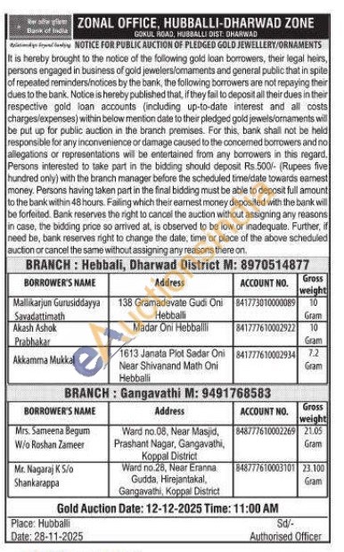 Bank of Baroda Gold Auctions Auction in Hubballi