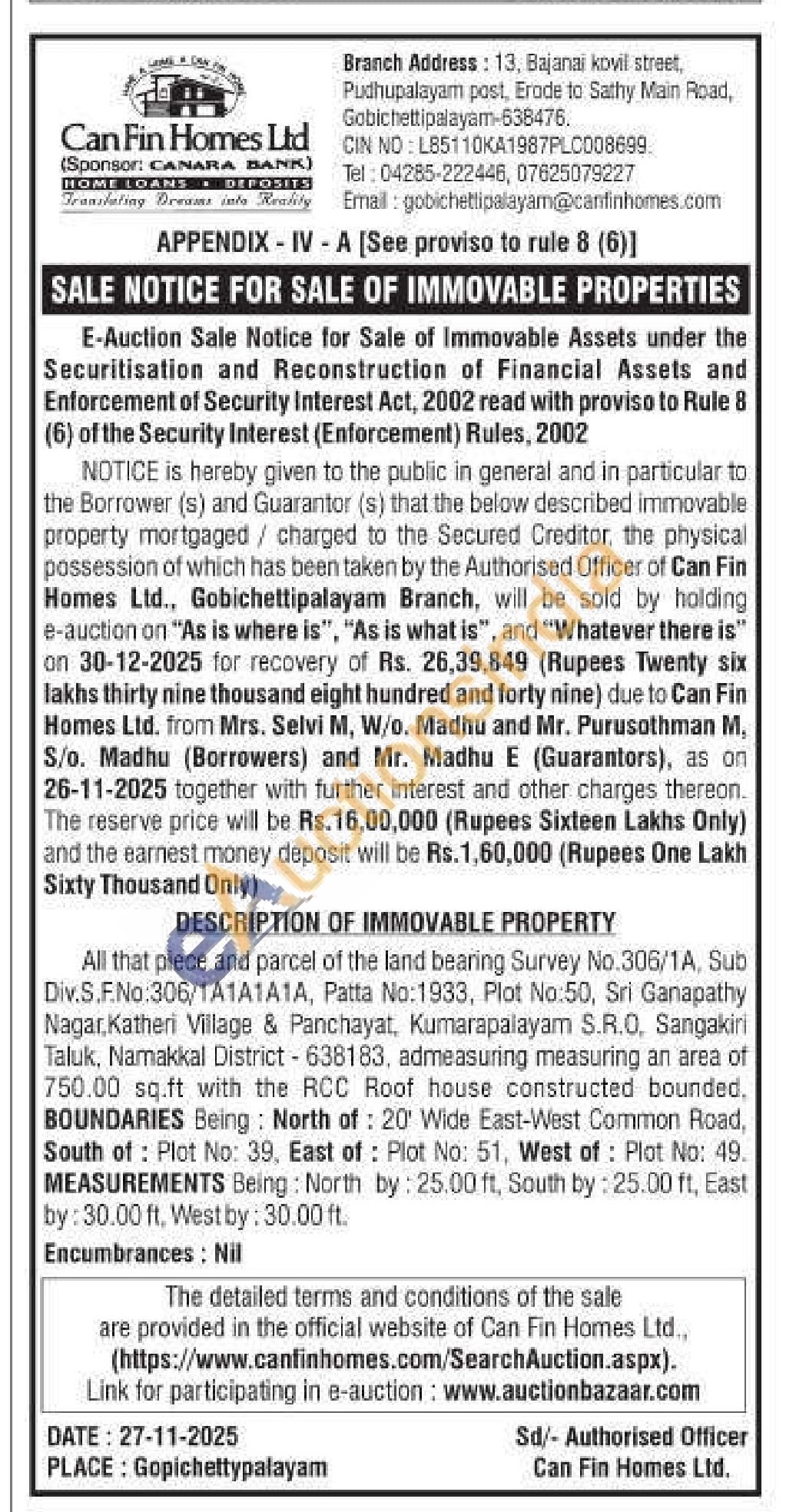 that piece and parcel of the land bearing Survey No.306/1A, Sub Div.S.F.No:306/1A1A1A1A, Patta No:1933, Plot No:50, Sri Ganapathy Nagar, Katheri Village & Panchayat, Kumarapalayam S.R.O, Sangakiri Taluk, Namakkal District - 638183, admeasuring measuring an area of 750.00 sq.ft with the RCC Roof house constructed bounded. BOUNDARIES Being: North of: 20' Wide East-West Common Road, South of Plot No: 39, East of: Plot No: 51, West of: Plot No: 49. MEASUREMENTS Being: North by: 25.00 ft, South by: 25.00 ft, East by: 30.00 ft. Westby: 30.00 ft.