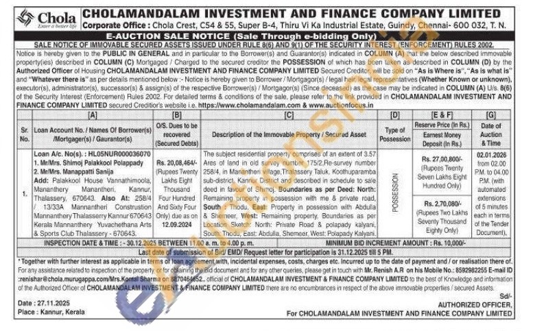 The subject residential property comprises of an extent of 3.57 Ares of land in old survey number 175/2.Re-survey number 258/4, in Manantheri village, Thalassery Taluk, Koothuparamba sub-district, Kannur District and described in schedule to sale deed in favour of Shmoj. Boundaries as per Deed: North: Remaining property in possession with me & private road, South Thodu. East: Property in possession with Abdula & Shemeer, West: Remaining property. Boundaries as per Location Sketch: North: Private Road & polapady kalyani, South: Thodu, East: Abdulla, Shemeer, West: Polapady Kalyani