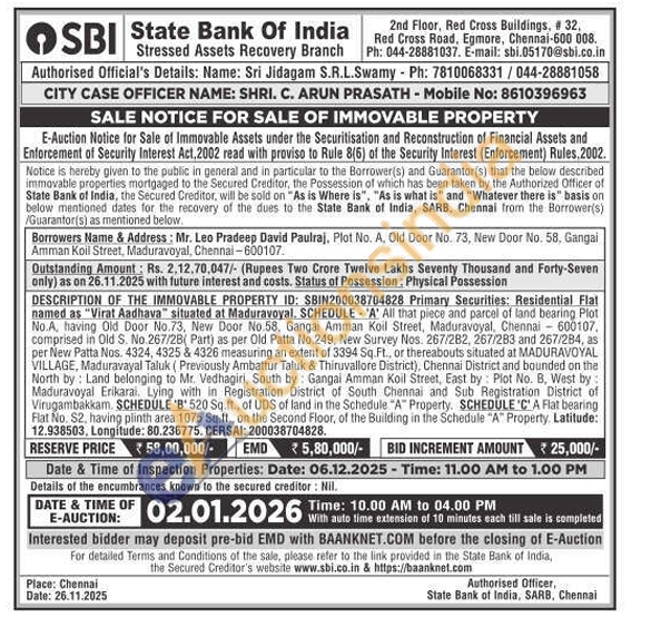 All that piece and parcel of land bearing Plot No.A, having Old Door No.73, New Door No.58, Gangai Amman Koil Street, Maduravoyal, Chennai 600107. comprised in Old S. No.267/28( Part) as per Old Patta No.249, New Survey Nos. 267/282, 267/283 and 267/284, as per New Patta Nos. 4324, 4325 & 4326 measuring an extent of 3394 Sq.Ft., or thereabouts situated at MADURAVOYAL VILLAGE, Maduravayal Taluk (Previously Ambattur Taluk & Thiruvallore District), Chennai District and bounded on the North by: Land belonging to Mr. Vedhagiri, South by: Gangai Amman Koil Street, East by Plot No. B, West by: Maduravoyal Erikarai. Lying with in Registration District of South Chennai and Sub Registration District of Virugambakkam. SCHEDULE 'B' 520 Sq.ft., of UDS of land in the Schedule "A" Property. SCHEDULE 'C' A Flat bearing Flat No. S2, having plinth area 1075 Sq.ft., on the Second Floor, of the Building in the Schedule "A" Property. Latitude: 12.938503. Longitude: 80.236775. CERSAI: 200038704828.