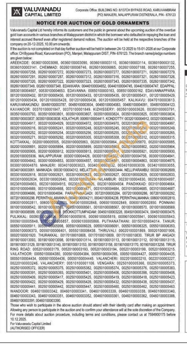 Valuvanadu Capital Limited Gold Auctions Auction in Malappuram