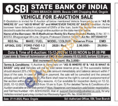 REG No. AP39GL 3352 MAKE/FUEL FORD FIGO 1.2 Petorl MODEL/COLOUR 2020/Red