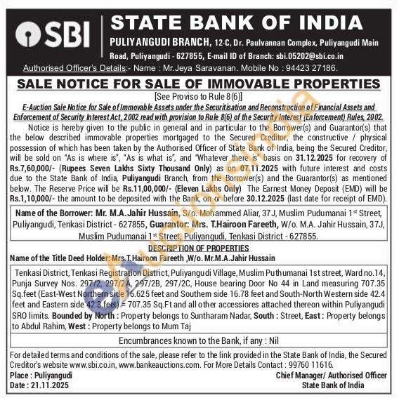 Tenkasi District, Tenkasi Registration District, Puliyangudi Village, Muslim Puthumanai 1st street, Ward no. 14, Punja Survey Nos. 297/2, 297/2A, 297/2B, 297/2C, House bearing Door No 44 in Land measuring 707.35 Sq.feet (East-West Northern side 16.625 feet and Southem side 16.78 feet and South-North Western side 42.4 feet and Eastern side 42.3 feet) = 707.35 Sq.Ft and all other accessiores attached thereon within Puliyangudi SRO limits. Bounded by North: Property belongs to Suntharam Nadar, South: Street, East: Property belongs to Abdul Rahim, West: Property belongs to Mum Taj