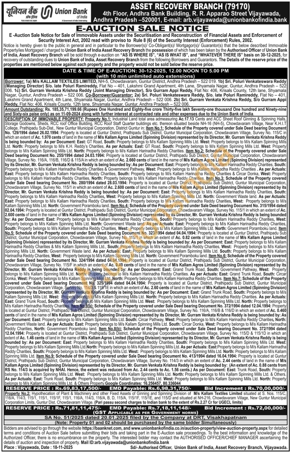 Property No.2: Hypothecation of Plant & Machinery and other Fixed Assets of Ginning and Spinning Division of Mis Kallam Textiles Limited situated at S. Nos. 115/C 116/A, 114/3, 115/1, 115/1, 115/1F, 115/1, 116/A, 114/3, 116/A, B, D, 115/A, 115/1F, 115/1E, and 115/D and situated at NH-216, Chowdavaram Village, New Guntur Municipal Corporation Limits, Guntur Dist. Chowdavaram Village. (Pari passu second charges to Indian bank to the extent of Rs.2.27 Cr for UGECL limits)