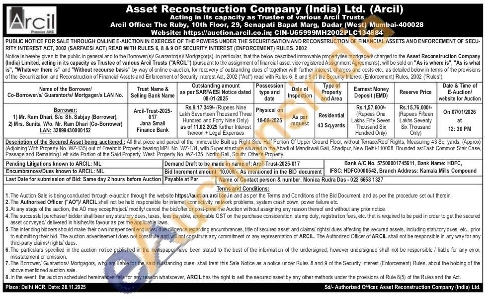 Description of the Secured Asset being auctioned.: All that piece and parcel of the Immovable Built up Right Side Half Portion Of Upper Ground Floor, without Terrace/Roof Rights, Measuring 43 Sq. yards, (Approx) (Adjoining With Property No. WZ-135) out of Freehold Property bearing MPL No. WZ-134, with Super structure situated in the Abadi of Mandirwali Gali, Shadipur, New Delhi-110008. Bounded as: East Common Stair Case, Passage and Remaining Left side Portion of the Said Property, West: Property No. WZ-135, North: Gali, South: Other's Property
