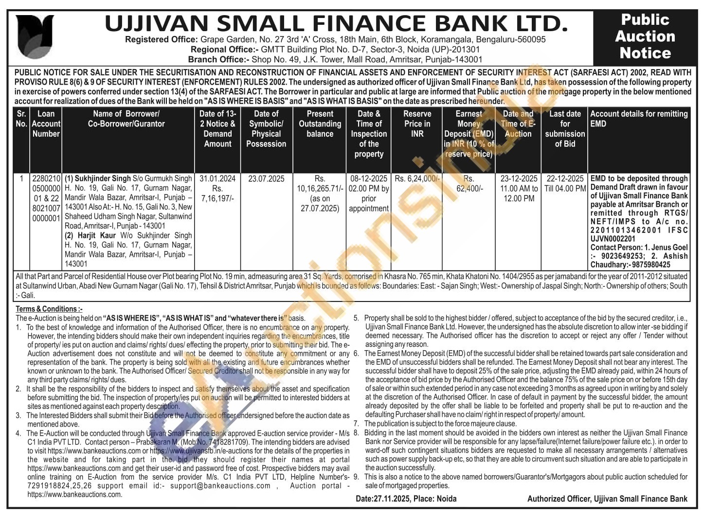 All that Part and Parcel of Residential House over Plot bearing Plot No. 19 min, admeasuring area 31 Sq. Yards, comprised in Khasra No. 765 min, Khata Khatoni No. 1404/2955 as per jamabandi for the year of 2011-2012 situated at Sultanwind Urban, Abadi New Gurnam Nagar (Gali No. 17), Tehsil & District Amritsar, Punjab which is bounded as follows: Boundaries: East: - Sajan Singh; West:-Ownership of Jaspal Singh; North:-Ownership of others; South -Gali