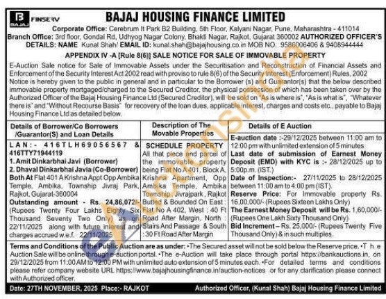 All that piece and parcel of the immovable property being Flat No A 401, Block A. Krishna Apartment, Opp , Ambika Temple, Ambika Township, Jivrajpark, Rajkot /- Butted & Bounded On East Six Flat No A 402, West: 40 Ft on Road After Margin, North and Stairs And Passage & South 30 Ft Road After Margin