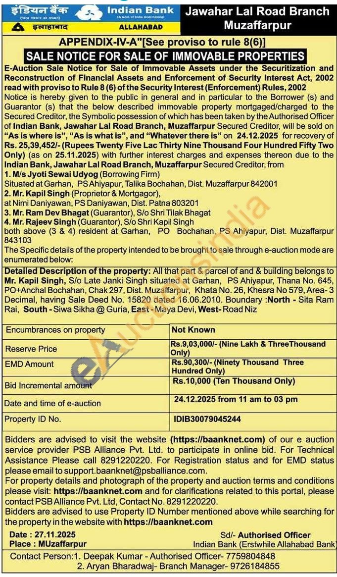 Detailed Description of the property: All that part & parcel of and & building belongs to Mr. Kapil Singh, S/o Late Janki Singh situated at Garhan, PS Ahiyapur, Thana No. 645, PO+Anchal Bochahan, Chak 297, Dist. Muzaffarpur, Khata No. 26, Khesra No 579, Area-3 Decimal, having Sale Deed No. 15820 dated 16.06.2010. Boundary: North - Sita Ram Rai, South-Siwa Sikha @ Guria, East - Maya Devi, West-Road Niz