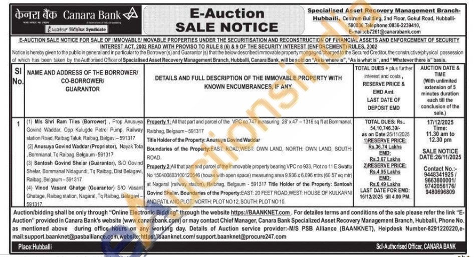 Property 1: All that part and parcel of the VPC no 747 measuring 28x47-1316 sq ft at Bommanal. Raibhag, Belgaum-591317 Title Holder of the Property: Anusuya Govind Waddar Boundaries of the Property: EAST: ROAD, WEST: OWN LAND, NORTH: OWN LAND, SOUTH: ROAD