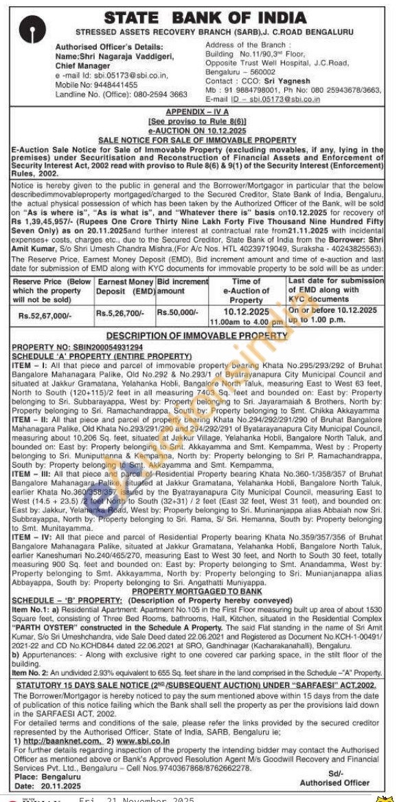 SCHEDULE 'A' PROPERTY (ENTIRE PROPERTY) ITEM 1: All that piece and parcel of immovable property bearing Khata No.295/293/292 of Bruhat Bangalore Mahanagara Palike, Old No.292 & No.293/1 of Byatrayanapura City Municipal Council and situated at Jakkur Gramatana, Yelahanka Hobli, Bangalore North Taluk, measuring East to West 63 feet, North to South (120+115)/2 feet in all measuring 7403 Sq. feet and bounded on: East by: Property belonging to Sri. Subbarayappa, West by: Property belonging to Sri. Jayaramaiah & Brothers, North by: Property belonging to Sri. Ramachandrappa, South by: Property belonging to Smt. Chikka Akkayamma ITEM-II: All that piece and parcel of property bearing Khata No. 294/292/291/290 of Bruhat Bangalore Mahanagara Palike, Old Khata No.293/291/290 and 294/292/291 of Byatarayanapura City Municipal Council, measuring about 10.206 Sq. feet, situated at Jakkur Village, Yelahanka Hobli, Bangalore North Taluk, and bounded on: East by: Property belonging to Smt. Akkayamma and Smt. Kempamma, West by: Property belonging to Sri. Muniputtanna & Kempanna, North by: Property belonging to Sri P. Ramachandrappa, South by: Property belonging to Smt. Akkayamma and Smt. Kempamma, ITEM III: All that piece and parcel of Residential Property bearing Khata No.360-1/358/357 of Bruhat Bangalore Mahanagara Palike, situated at Jakkur Gramatana, Yelahanka Hobli, Bangalore North Taluk, earlier Khata No.360/358/357 issued by the Byatrayanapura City Municipal Council, measuring East to West (14.5+ 23.5) 12 feet North to South (32-31)/2 feet (East 32 feet, West 31 feet), and bounded on: East by: Jakkur, Yelahanka Road, West by: Property belonging to Sri. Muninanjeppa alias Abbalah now Sri. Subbrayappa, North by: Property belonging to Sri. Rama, S/ Sri. Hemanna, South by: Property belonging to Smt. Munitayamma. ITEM-IV: All that piece and parcel of Residential Property bearing Khata No. 359/357/356 of Bruhat Bangalore Mahanagara Palike, situated at Jakkur Gramatana, Yelahanka Hobli, Bangalore North Taluk, earlier Kaneshumari No.240/465/270, measuring East to West 30 feet, and North to South 30 feet, totally measuring 900 Sq. feet and bounded on: East by: Property belonging to Smt. Anandamma, West by: Property belonging to Smt. Akkayamma, North by. Property belonging to Sri. Munianjanappa alias Abbayappa, South by: Property belonging to Sri. Angathatti Muniyappa.