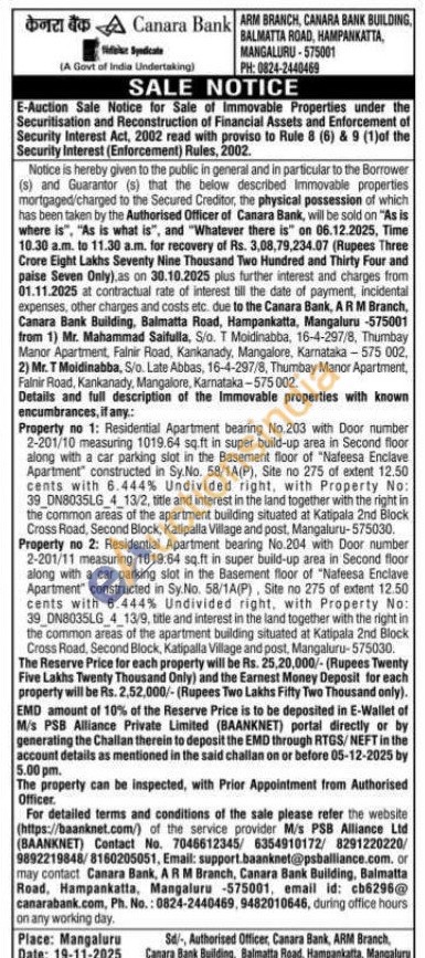 Property no 1: Residential Apartment bearing No.203 with Door number 2-201/10 measuring 1019.64 sq.ft in super build-up area in Second floor along with a car parking slot in the Basement floor of "Nafeesa Enclave Apartment constructed in Sy.No. 58/1A(P), Site no 275 of extent 12.50 cents with 6.444% Undivided right, with Property No: 39 DNB035LG 4_13/2, title and interest in the land together with the right in the common areas of the apartment building situated at Katipala 2nd Block Cross Road, Second Block, Katipalla Village and post, Mangaluru-575030. Property no 2: Residential Apartment bearing No.204 with Door number 2-201/11 measuring 1019.64 sq.ft in super build-up area in Second floor along with a car parking slot in the Basement floor of "Nafeesa Enclave Apartment constructed in Sy.No. 58/1A(P), Site no 275 of extent 12.50 cents with 6.444% Undivided right, with Property No: 39 DN8035LG 4 13/9, title and interest in the land together with the right in the common areas of the apartment building situated at Katipala 2nd Block Cross Road, Second Block, Katipalla Village and post, Mangaluru-575030