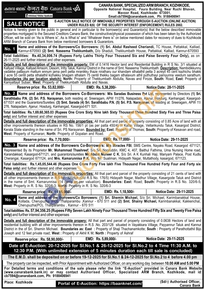 Details and full description of the immovable propery: All that part and parcel of property consisting of 0.0638 Hectors of land and residential building with all other improvements thereon in R.S.No. 203/128 situated in Vayakkara Village, Payyannur Taluk and Kannur District in the of Sri. Shemin Michael. Boundaries as: East: Property of Shaji Thachanamkotte; South: Property of Parathottathil Bijo Joseph and 12 feet private road; West: Property of Akhil KM; North: Property of Ashraf