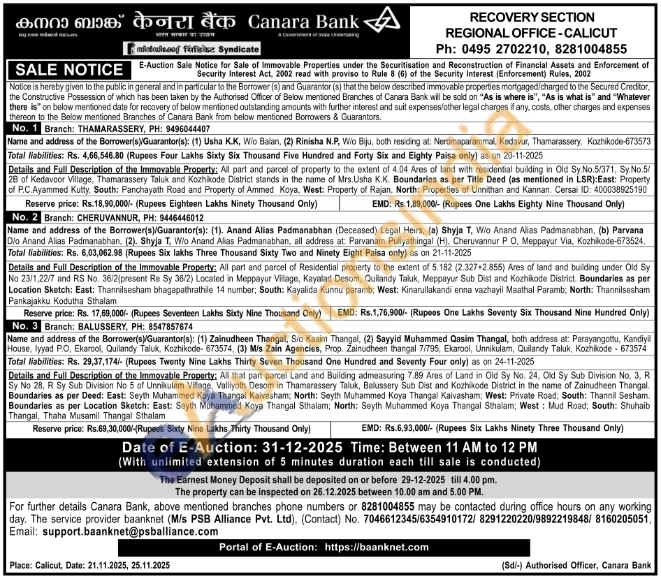 Details and Full Description of the Immovable Property: All part and parcel of property to the extent of 4.04 Ares of land with residential building in Old Sy.No.5/371, Sy.No.5/2B of Kedavoor Village, Thamarassery Taluk and Kozhikode District stands in the name of Mrs. Usha K.K. Boundaries as per Title Deed (as mentioned in LSR): East: Property of P.C.Ayammed Kutty, South: Panchayath Road and Property of Ammed Koya, West: Property of Rajan, North: Properties of Unnithan and Kannan. Cersai ID: 400038925190