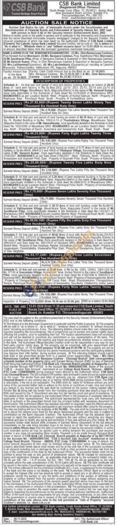 Schedule E: All that part and parcels of 20.72 Ares of land with building under Re.Sy 68/14, located at Vallikunnam Village, Mavellikkara Taluk Alapuzaha District in the name of Mr Sasidharan Pillai, more specifically detailed in the Schedule in Sale deed No. 1142/2011 of Bharanikavu SRO BOUNDARIES as per Location Sketch: West: Panchayat Road, North Canal, East: Road, South Property of Pularethu and Property of Gopakumar