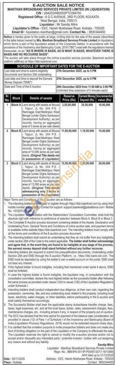 Block A : Land along with assets at Mouza Tajpur, JL No. 244 P.S. Ramnagar, East Medinipur, West Bengal (under Digha Sankarpur Development Authority), as per records, having an aggregate area of 3 acres as per sale deeds