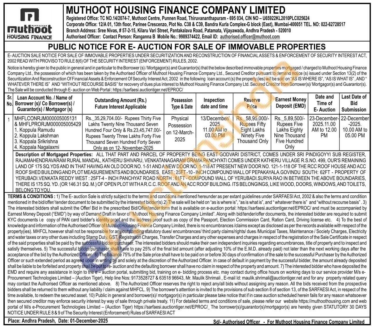 Authorised Officer: Contact Person: Ranganna B Mobile No : 9989374422