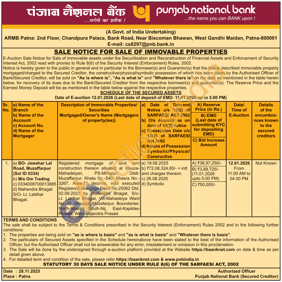 Registered mortgage of land and construction thereon situated at Mauza- Mahadeiyan, PS-Minapur, Muzaffarpur, Khata No.-540, Khesra No.-3267, Area-71 decimal, vide executed Registered Mortgage Deed No.25062 Dtd. 02.09.2023 by Mahendra Bhagat, S/o-Lt. Laldhar Bhagat, Vill-Mahadeiya Ward No.-12, Minapur, Muzafarpur. Boundaries: North-Road, South-Nij, East-Kapildeo Prasad, West-Rajendra Prasad