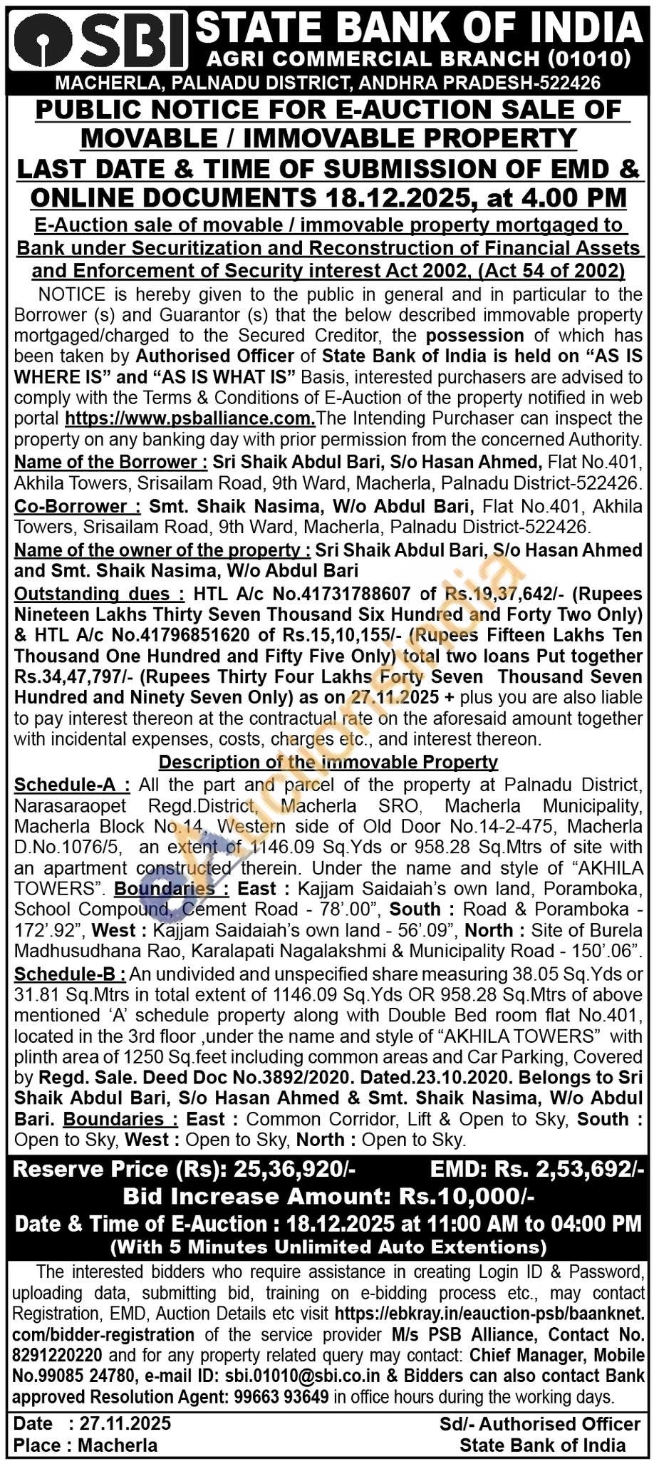 Schedule-A: All the part and parcel of the property at Palnadu District Narasaraopet Regd. District, Macherla SRO, Macheria Municipality, Macherla Block No.14, Western side of Old Door No.14-2-475, Macherla D.No.1076/5, an extent of 1146.09 Sq. Yds or 958.28 Sq.Mtrs of site with an apartment constructed therein. Under the name and style of "AKHILA TOWERS". Boundaries: East: Kajjam Saidaiah's own land, Poramboka, School Compound, Cement Road 78.00", South Road & Poramboka 172.92", West: Kajjam Saidaiah's own land - 56'.09", North: Site of Burela Madhusudhana Rao, Karalapati Nagalakshmi & Municipality Road - 150.06", Schedule-B: An undivided and unspecified share measuring 38.05 Sq. Yds or 31.81 Sq.Mtrs in total extent of 1146.09 Sq. Yds OR 958.28 Sq. Mtrs of above mentioned 'A' schedule property along with Double Bed room flat No.401, located in the 3rd floor, under the name and style of "AKHILA TOWERS" with plinth area of 1250 Sq.feet including common areas and Car Parking, Covered by Regd. Sale. Deed Doc No.3892/2020. Dated.23.10.2020. Belongs to Sri Shaik Abdul Bari, S/o Hasan Ahmed & Smt. Shaik Nasima, W/o Abdul Bari. Boundaries: East: Common Corridor, Lift & Open to Sky, South: Open to Sky, West: Open to Sky, North: Open to Sky.