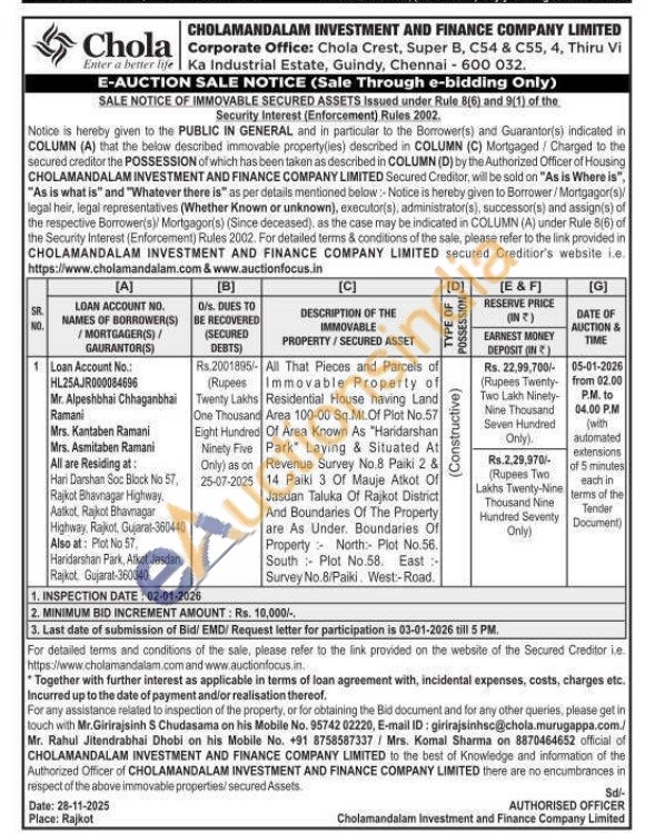 All That Pieces and Parcels of Immovable Property of Residential House having Land Area 100-00 Sq.Mt. Of Plot No.57 Of Area Known As "Haridarshan Park Laying & Situated At Revenue Survey No.8 Paiki 2 & 14 Paiki 3 Of Mauje Atkot Of Jasdan Taluka Of Rajkot District And Boundaries Of The Property are As Under. Boundaries Of Property North: Plot No.56. South Plot No.58. East: Survey No.8/Paiki. West:-Road