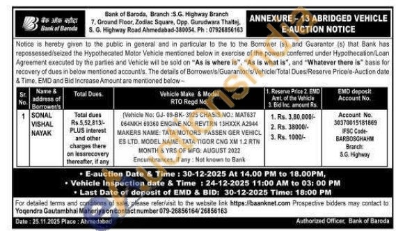 Vehicle No: GJ-09-BK-3925 CHASIS NO.: MAT637 064NKH 69360 ENGINE NO: REVTRN 13HXXK A2944 MAKERS NAME TATA MOTORS PASSEN GER VEHICL ES LTD. MODEL NAME: TATA TIGOR CNG XM 1,2 RTN MONTH & YRS OF MFG: AUGUST 2022 Encumbrances, if any: Not known to Bank