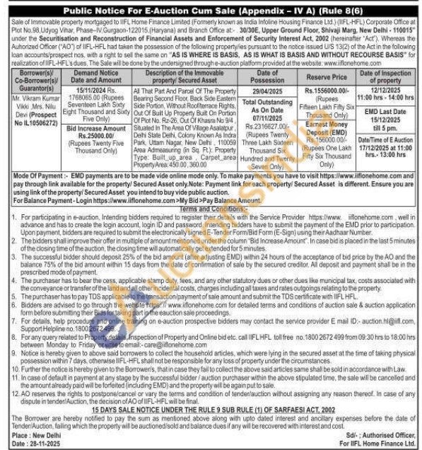 All That Part And Parcel Of The Property Bearing Second Floor, Back Side Eastem Side Portion, Without Roofiterrace Rights. Out Of Built Up Property Built On Portion Of Pict No. Rz-26, Out Of Khasra No 94, Situated in The Area Of Vilage Asalatpur Delhi State Delhi, Colony Known As Indra Park. Uttam Nagar, New Delhi 110059 Area Admeasuring (in Sq Ft) Property Type. Built up area, Carpet area Property Areas 450.00,300.00