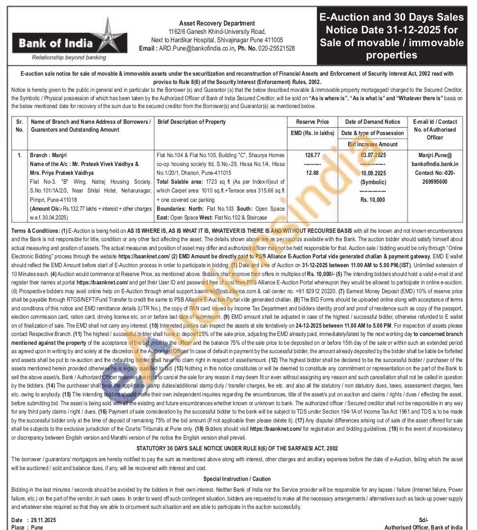 Flat No.104 & Flat No. 105, Building "C", Shaurya Homes co-op housing society Itd. S.No-29, Hissa No. 1/4, Hissa No. 1/20/1, Dhanori, Pune-411015 .Total Salable area: 1723 sq ft (As per Index-lijout of which Carpet area: 1010 sq.ft. Terrace area 315.66 sq.ft + one covered car parking Boundaries: North: Fiat No.103 South: Open Space East: Open Space West: Flat No. 102 & Staircase