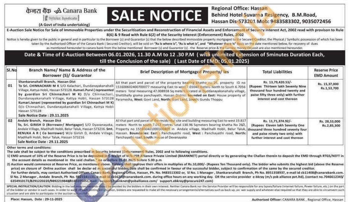 All that part and parcel of the property bearing khatha no 26, property ID no 151500602400700077 measuring East to west 7.01040 meters North to South 6.7056 meters Total measuring 47.008938 Sq meters located at Duddanayakanahally village, Shettihally grama panchayath, Hassan District bounded on East: House property of Paramesha, West: Govt Land, North: Govt Land, South: Gundu Thoppu