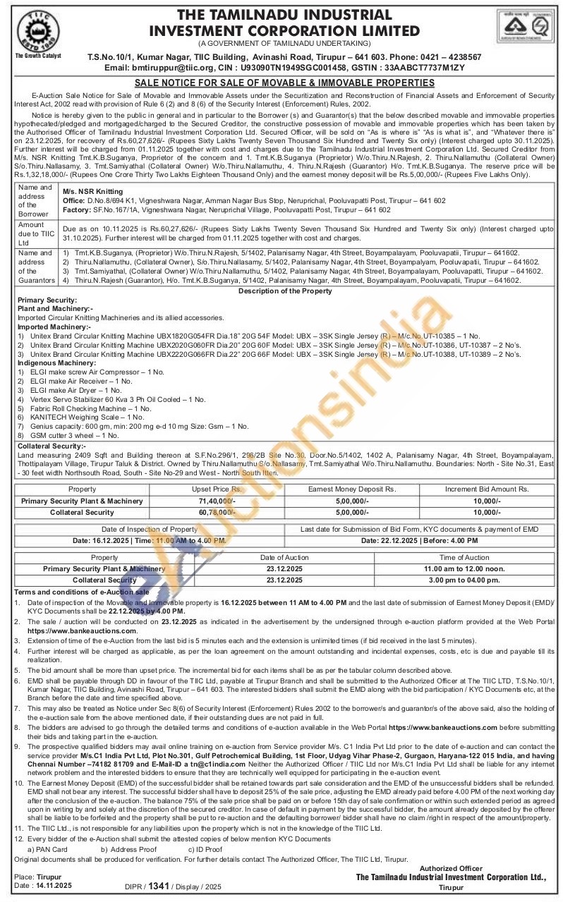 1)Primary Security: Plant and Machinery: Imported Circular Knitting Machineries and its allied accessories. 1) Unitex Brand Circular Knitting Machine UBX1820G054FR 0.18 20G 54F Model: UBX-3SK Single Jersey (R)-M/c, No. UT-10385-1 No. Imported Machinery:- 2) Unitex Brand Circular Knitting Machine UBX20200060FR Di20 200 60F Model: UBX-35K Single Jersey (R)-M/c. No. UT-10386, UT-10387-2 No Unitex Brand Circular Knitting Machine UBX22200066FR Die 22" 200-66F Model: UBX-3SK Single Jersey (R)-M/c. No. UT-10388, UT-10389-2 No Indigenous Machinery: 1) ELGI make screw Air Compressor-1 No 2) ELGI make Air Receiver-1 No. 3) ELGI make Air Dryer-1 No. 4) Vertex Servo Stabilizer 60. Kys 3 Ph Oil Cooled-1 ho 5) Fabric Roll Checking Machine-1. No. 6) KANITECH Weighing Scale-1 No. 7) Genius capacity: 600 gm, min: 200 mg e-d 10 mg Size: Gsm-1 No. 8) GSM cutter 3 wheel-1 No