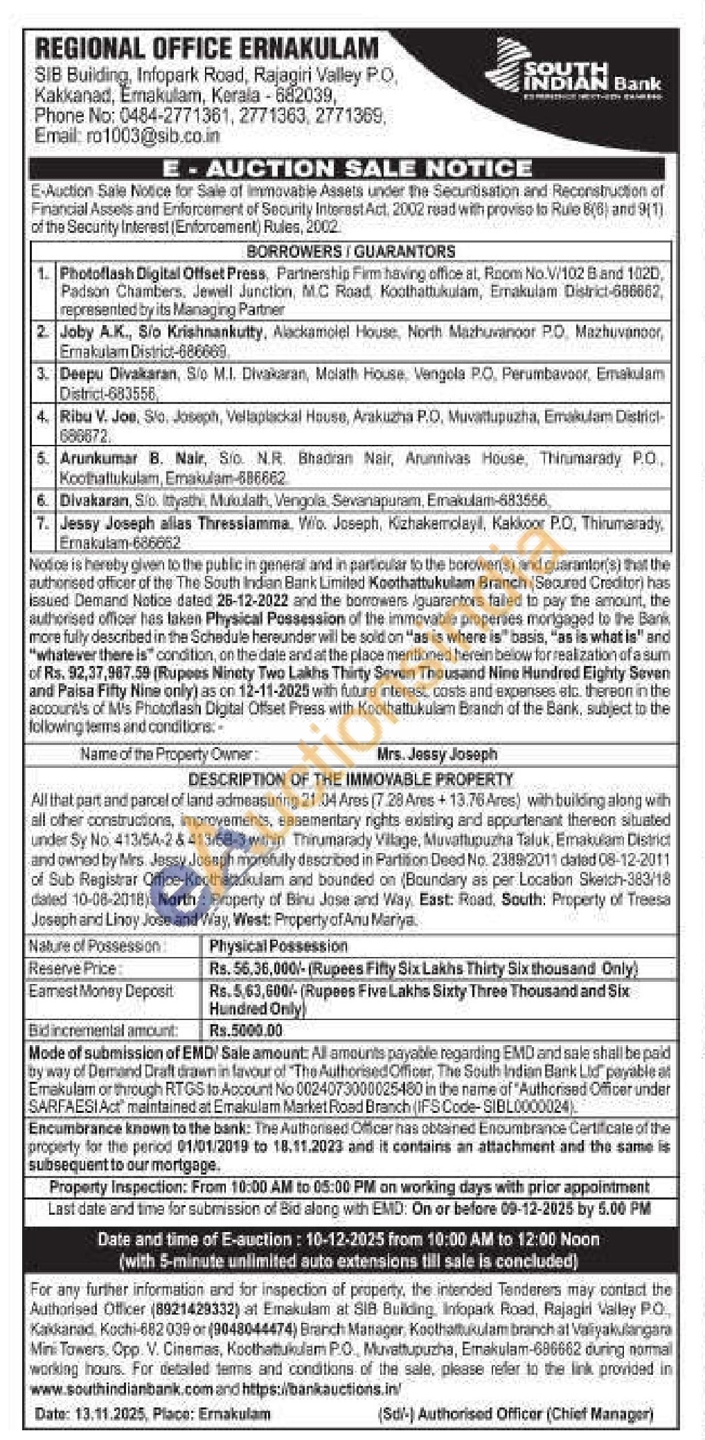 All that part and parcel of land admeasuring 21.04 Ares (7.28 Ares +13.76 Ares) with building along with all other constructions, improvements, easementary rights existing and appurtenant thereon situated under Sy No. 413/5A-2&413/58-3 within Thirumarady Village, Mavattupuzha Taluk, Emakulam District and owned by Mrs. Jessy Joseph morefully described in Partition Deed No. 2388/2011 dated 08-12-2011 of Sub Registrar Office-Koothattukulam and bounded on (Boundary as per Location Sketch-383/18 dated 10-08-2018). North: Property of Binu Jose and Way, East: Road, South: Property of Treesa Joseph and Linoy Jose and Way, West: Property of Anu Mariya