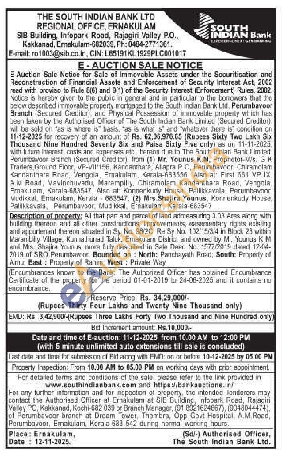 All that part and parcel of land admeasuring 3.03 Ares along with building thereon and all other constructions, improvements, easementary rights existing and appurtenant thereon situated in Sy. No. 98/2C, Re Sy No. 102/15/3/4 in Block 23 within Marambilly Village, Kunnathunad Taluk, Ernakulam District and owned by Mr. Younus KM and Mrs. Shajira Younus, more fully described in Sale Deed No. 1577/2019 dated 12-04-2019 of SRO Perumbavoor. Bounded on: North: Panchayath Road; South: Property of Aimu: East: Property of Rahim, West: Private Way