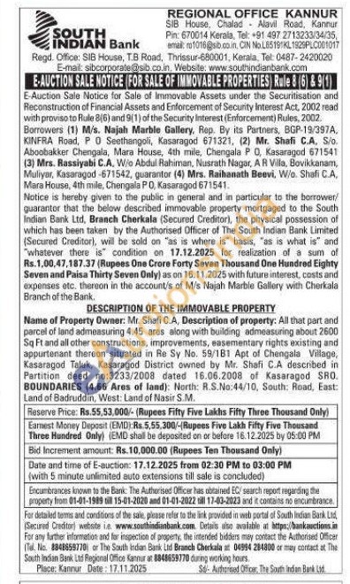 All that part and parcel of land admeasuring 4.45 ares along with building admeasuring about 2600 Sq Ft and all other constructions, improvements, easementary rights existing and appurtenant thereon situated in Re Sy No. 59/181 Apt of Chengala Village, Kasaragod Taluk, Kasaragod District owned by Mr. Shafi C.A described in Partition deed no:3233/2008 dated 16.06.2008 of Kasaragod SRO. BOUNDARIES (4.66 Ares of land): North: R.S.No:44/10, South: Road, East: Land of Badruddin, West: Land of Nasir S.M.