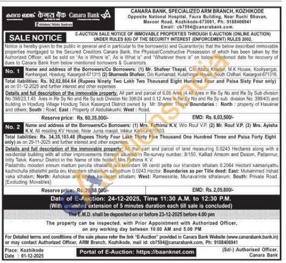 Details and full description of the immovable property: All that part and parcel of land measuring 0.0243 Hectares along with a residential building with all other improvements thereon situated in Re-survey number. 8/150, Kalliad Amsom and Desom, Pattannur, Initty Taluk, Kannur District in the Name of title holder: Mrs.Fathima KV Padathittu mooden ennum mattum perulla sthalathil oru khandam 98 centii petta our khandant sthalam 0.2064 Hectoni kaimanyathu kazhichulla sthalathil petta oru khandam sthalavum sarvathum 0.0243 Hector. Boundaries as per Title deed: East: Muhammed Irshad vaka sthalam North: Ashokan and others kaivasam sthalam, West: Rameesinte, Munavarinte sthalavum, South: Private Road. [Excluding Movables]