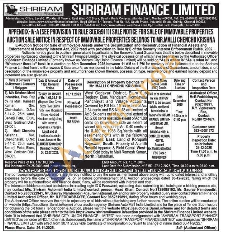 Authorized Officer, Mr.R.Peddabbayee, Contact No: 9652519891. K.Y. Vigneswara Rao, Contact No.8047244674