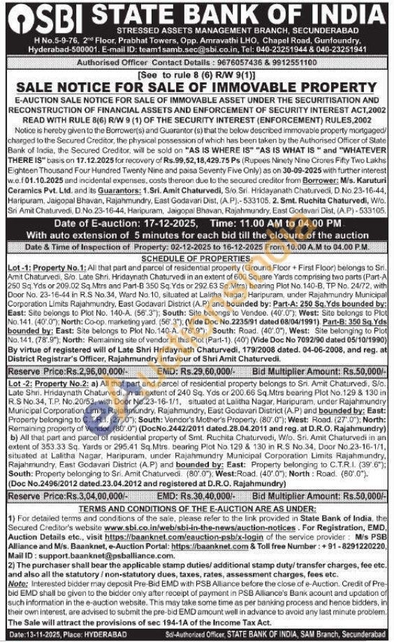 Lot-1: Property No.1: All that part and parcel of residential property (Ground Floor + First Floor) belongs to Sri. Amit Chaturvedi, Sio. Late Shri. Hridaynath Chaturvedi in an extent of 600 Square Yards comprising two parts (Part-A 250 Sq. Yds or 209.02 Sq.Mtrs and Part-B 350 Sq. Yds or 292.63 Sq.Mtrs) bearing Plot No. 140-B, TP No. 24/72, with Door No. 23-16-44 in R.S No.34, Ward No. 10, situated at Lalitha Nagar, Haripuram, under Rajahmundry Municipal Corporation Limits Rajahmundry, East Godavari District (A.P) and bounded by: Part-A: 250 Sq. Yds bounded by: East: Site belongs to Plot No. 140-A. (56.3"); South: Site belongs to Vendee. (40.0"); West: Site belongs to Plot No. 141. (40.0"); North: Co-op. marketing yard. (56.3"), (Vide Doc No.2235/91 dated 08/04/1991) Part-B: 350 Sq. Yds bounded by: East: Site belongs to Plot No. 140-A. (78.9"); South: Road. (40.0"), West: Site belonging to Plot No. 141. (78'.9"); North: Remaining site of vendor in this Plot (Part-1). (40') (Vide Doc No 7092/90 dated 05/10/1990) By virtue of registered will of Late Shri Hridaynath Chaturvedi, 179/2008 dated. 04-06-2008, and reg. at District Registrar's Officer, Rajahmundry infavour of Shri Amit Chaturvedi.