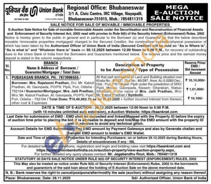 All that part and parcel of Land and Building situated over Khata No.: 97/237, Plot No.: 60/297, Area: Ac.0.0283 Dec., Dist.: Puri, PS/Tahasil: Pipili under the jurisdiction of SRO: Pradhan, At: Gaonpada, PO/PS: Pipili, Puri, Odisha Pipili, Mouza: Gaonpada, Kissam: Gharabari