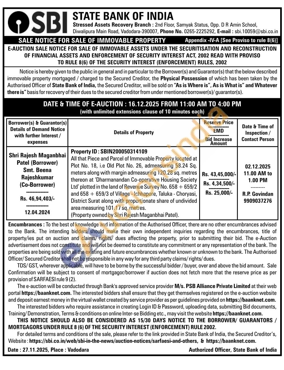All that Piece and Parcel of Immovable Property located at Plot No. 18, i.e Old Plot No. 26, admeasuring 58.24 Sq. meters along with margin admeasuring 120.28 sq. metres thereon at 'Dharmanandan Co-operative Housing Society Ltd' plotted in the land of Revenue Survey No. 658 +659/2 and 658 + 659/3 of Village - Ichhapore, Taluka - Choryasi, District Surat along with proportionate share of undivided area measuring 101.17 sq. metres