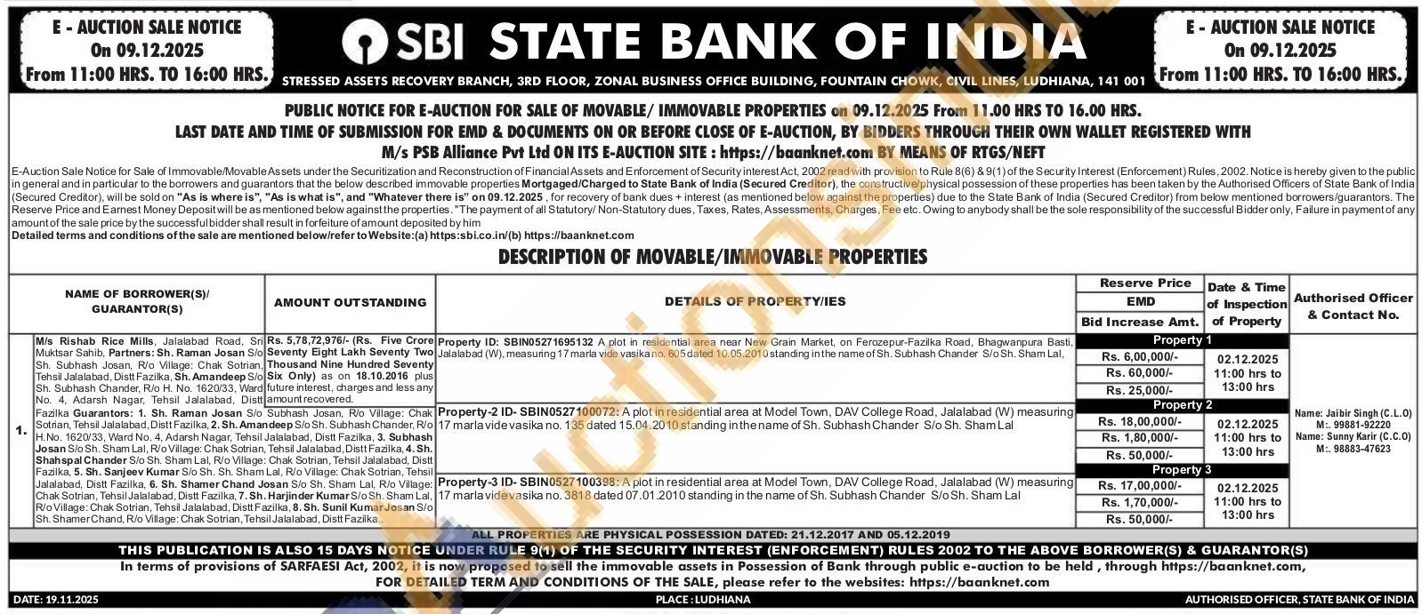 1) A plot in residential area near New Grain Market, on Ferozepur-Fazilka Road, Bhagwanpura Banti, Jalalabad (W), measuring 17 marla vide vasikano. 605 dated 10.05.2010 standing in the name of Sh. Subhash Chander Sto Sh. Sham Lal