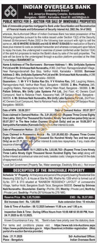 Schedule "A" Property: All that piece and parcel of the property bearing Residential Site Measuring 3250 Sq.Ft. & House at Site No 286, Khatha No. 1359 which is formed out of Sy.No. 37/1 & 37/3 situated at "RAINBOW RESIDENCY LAYOUT of Junnasandra Village, Varthur Hobil, Bangalore South Taluk, Bangalore 560035. Owned by Srinivas Naik Nunavathu: Boundaries: East by: Plot No. 285, Westby: Private Land, North by Private Land, South by: Plot No 287 & House No.278/MIG.
