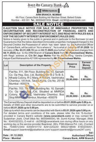 Flat No. 703, 7th Floor, Building No. 16, Sainath Co. Op Hsg, Soc. Ltd, Situated at MMRDA Colony, RC Marg, Vashinaka Chembur, Bus Stop MMRDA Chembur, Mumbai-400076