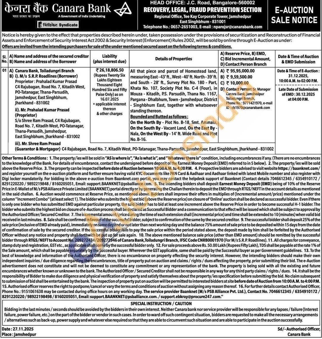 All that piece and parcel of Homestead land, measuring East-43' ft., West-40'ft. North-39' ft. and South-28' ft., Survey Plot No. 180-Part, Khata No. 107, Society Plot No. C-4 (Four), in Mouza Kitadih, P.S. Parsudih, Thana No. 1167, Pargana-Dhalbhum, Town-Jamshedpur, District Singhbhum East, together with whatsoever standing thereon.Bounded and Butted as follows: On the North By - Plot No. B-18, Smt. Ammalu, On the South By - Vacant Land, On the East By-Nala, On the West By-14' ft. Wide Road and Plot No. B-16.